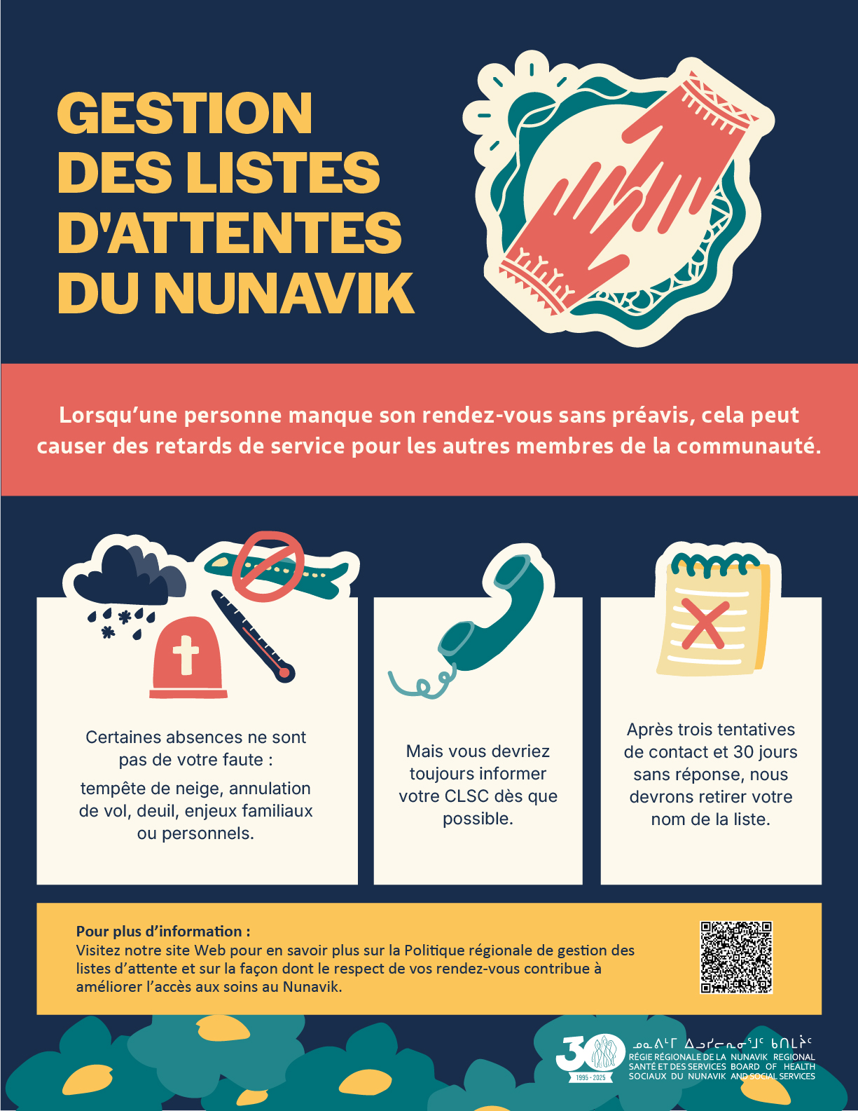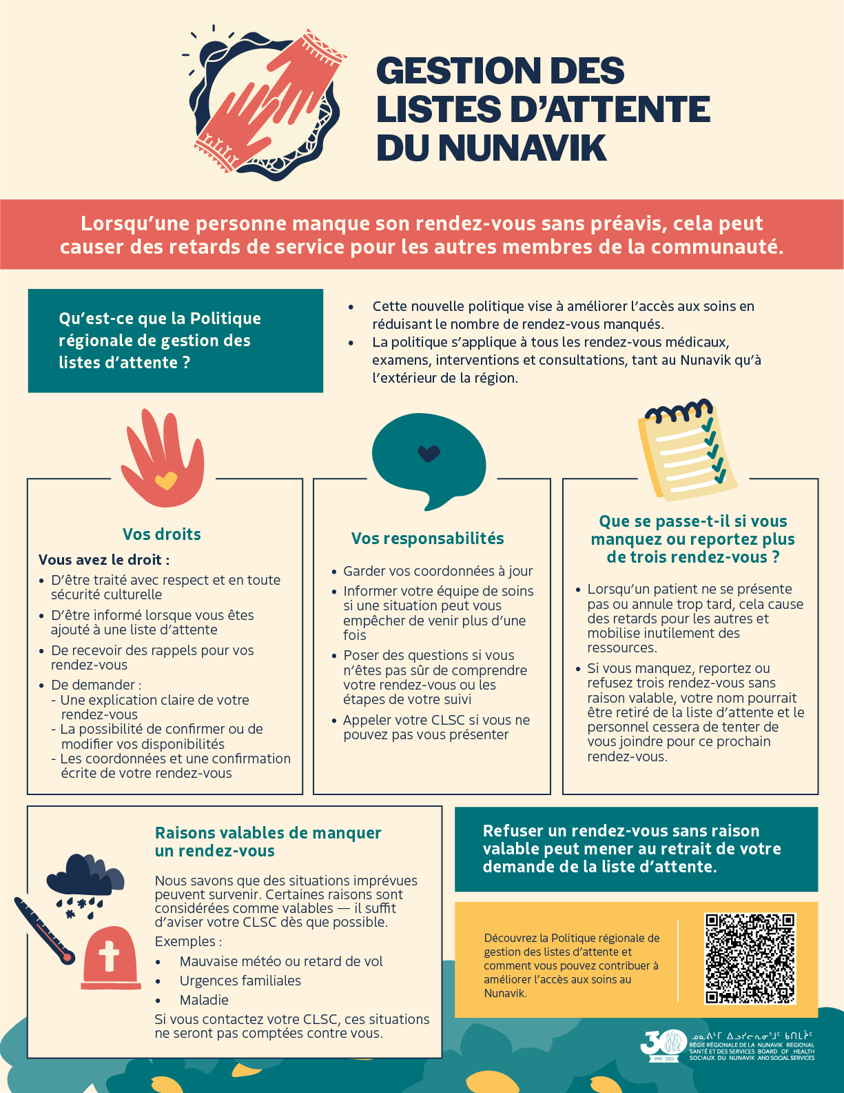 - Cette politique s’applique à tous les rendez-vous médicaux, examens, interventions et consultations, au Nunavik et à l’extérieur de la région.
